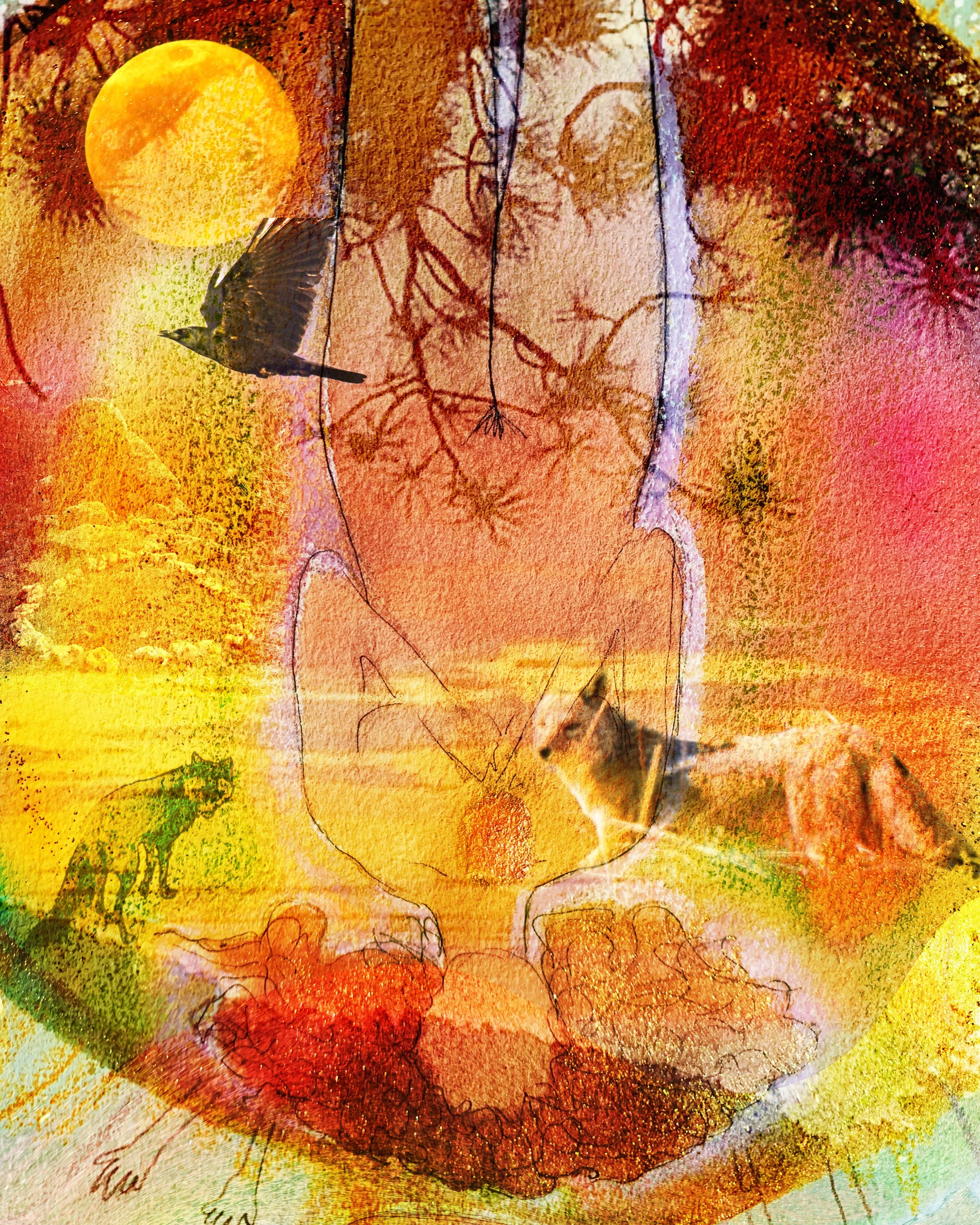 The FoxSpell series was conceived within the Front Range Mountains of Colorado where Violet, a wild black fox with copper eyes, auspiciously appeared to me during a cold, winter sunrise and there remained during a time of emotional turbulence. My estranged mother was suddenly dying, and with that, challenging memories and beliefs confronted me. I was in need of this very companion, a muse, and some intriguing reflection of my soul. During this time, I wrote, drew, painted, collaged, and took endless photographs of Violet, the spectacular land, and all its inhabitants. Her presence comforted and inspired me.
